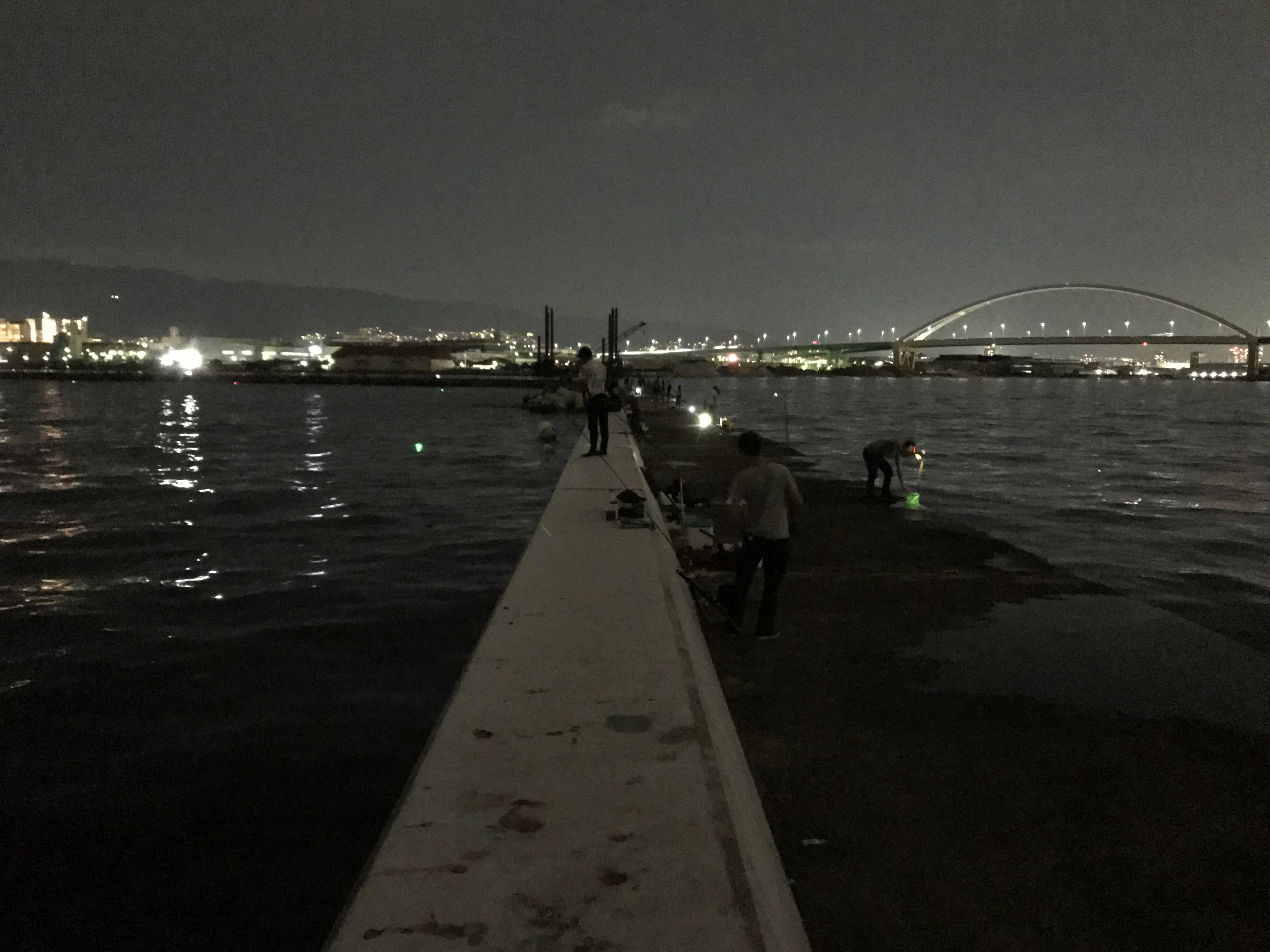 やはり、この季節の西宮ケーソンは物凄い人ですね。ファミリーでサビキを楽しんでいたり、カップルが釣りを楽しんでいたり、釣り仲間と来ていたり、一人で楽しんでいたりと。堤防の外向きは人、人、人で埋め尽くされいて入る隙もありません(汗)なので、第2カーブを過ぎ昨年の台風21号で崩壊したあたりの東向きでショワジギを楽しみました。