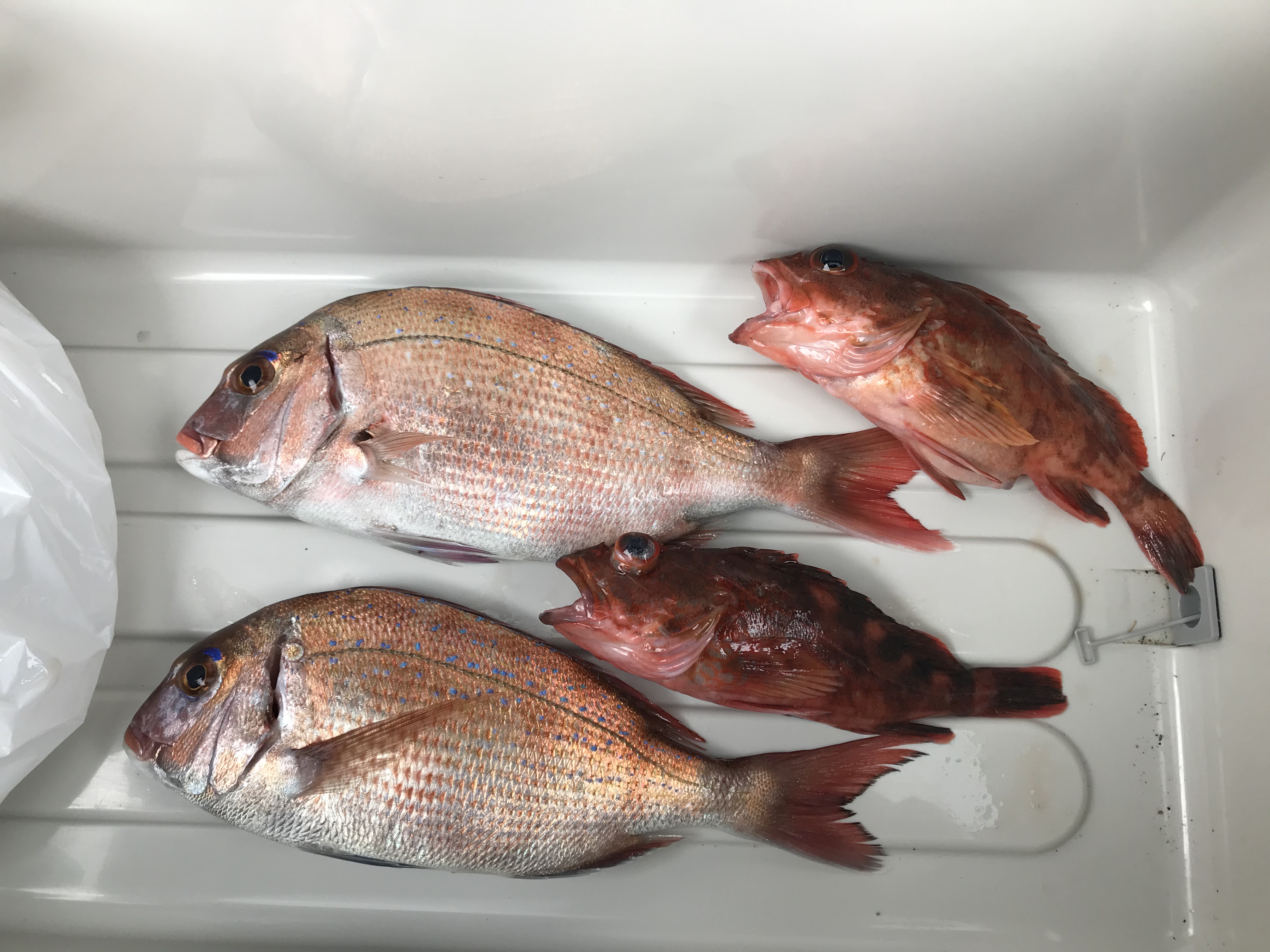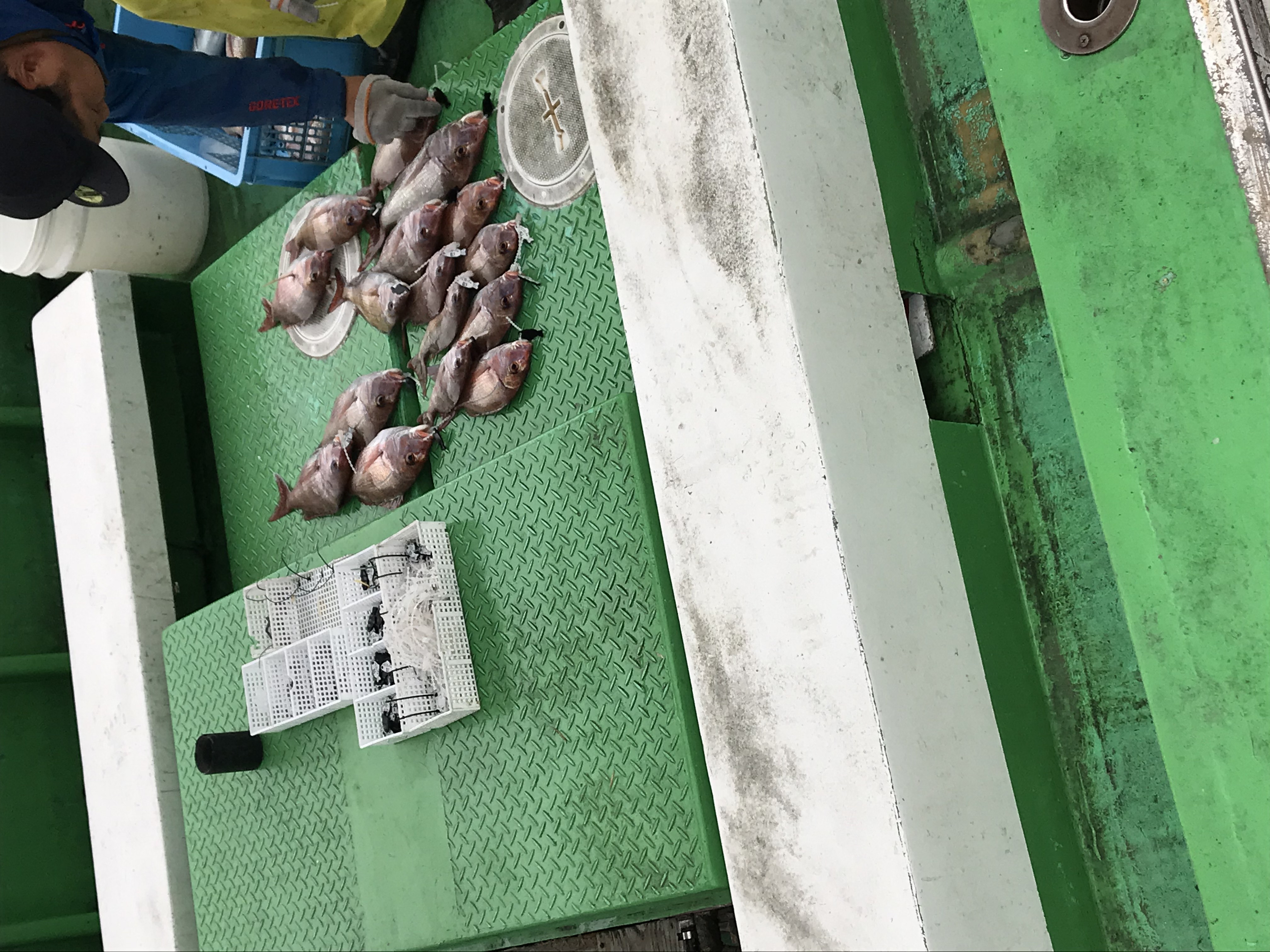 帰港時に釣果のチェックボードを見ましたが乗船客14名で竿頭は鯛5枚が1名、次いで4枚が1名、2枚が自信を含め4名、1枚2名ボウズが6名(この6名は鯛が0でその他の生けすに入れないカウントされない魚を釣っている可能性はあります)