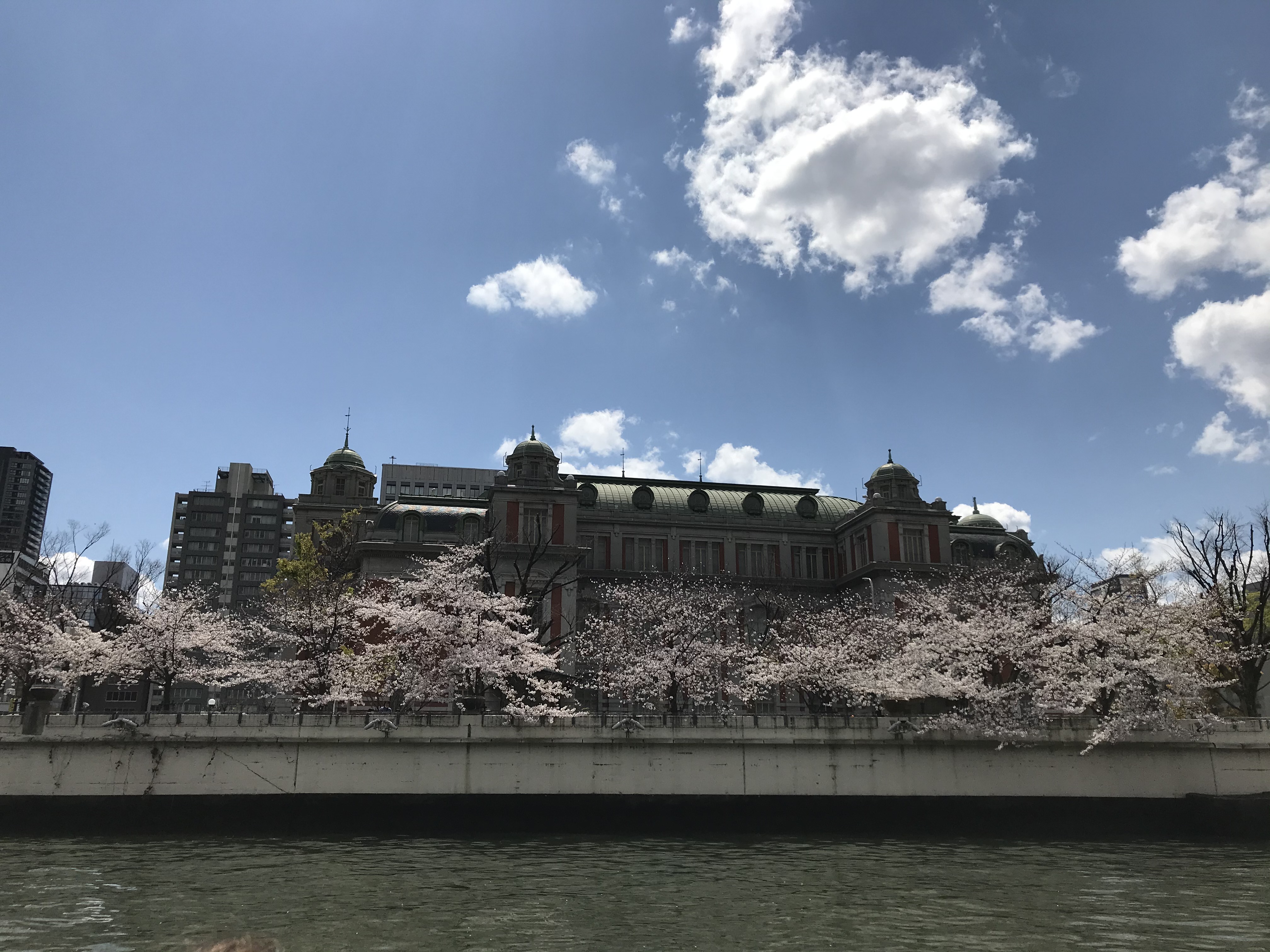 大阪市役所、大阪府立中之島図書館、大阪市中央公会堂と続き、中之島公園芝生広場、剣先噴水までくると岸には桜並木が広がります!!
