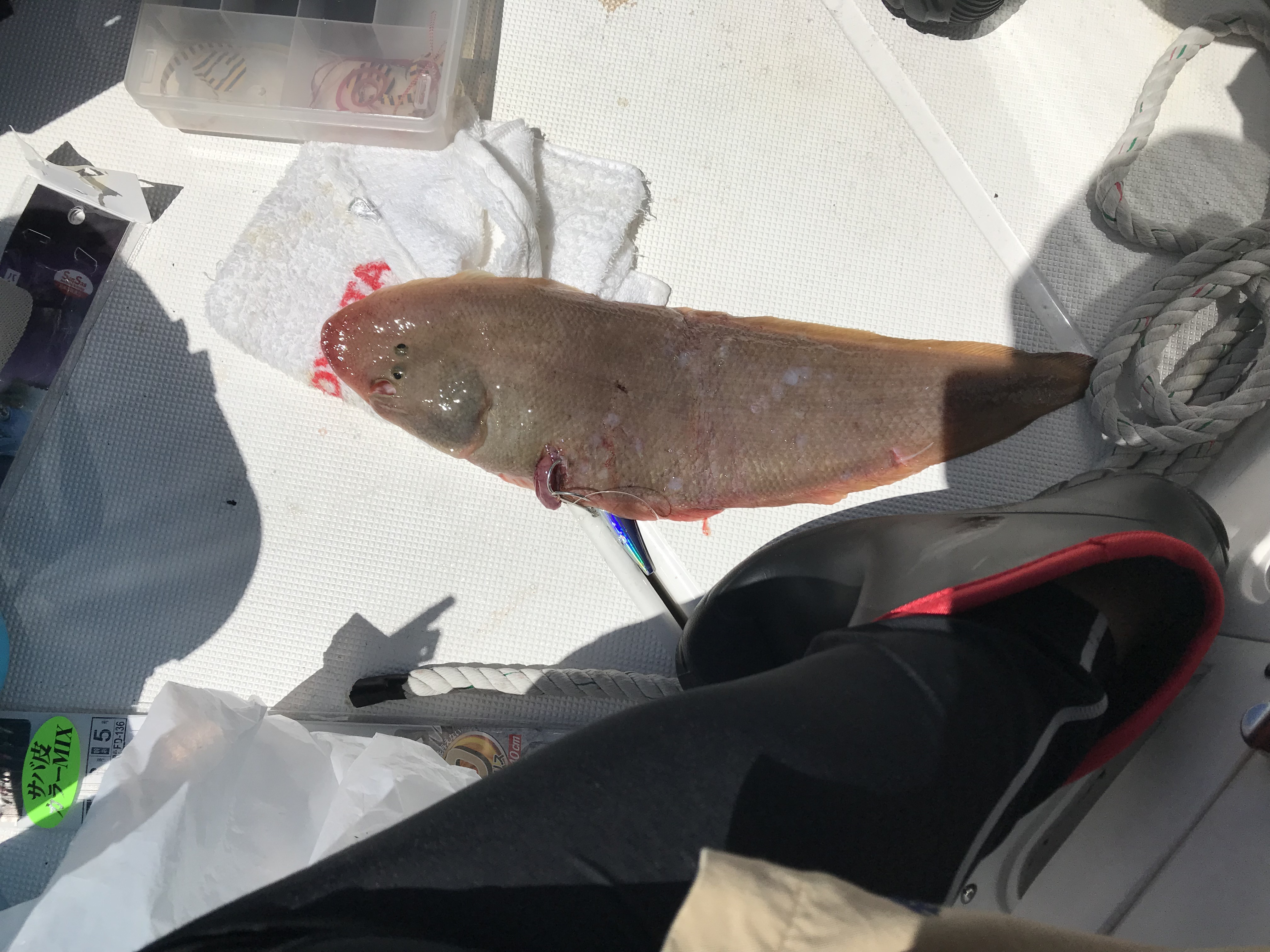 魚探の反応は良いものの全く当たりはありません。後輩達にテンヤを任せて自分は船酔いしている後輩のアジサビキのままになっているタックルを借りて中層を狙いますがこれも当たりは無し。それならと太刀魚ジギングに切り替えて何回かボトムを取っていると底で違和感あり。当たりというより根掛かり?と思いつつ回収していると何か重い感じ!