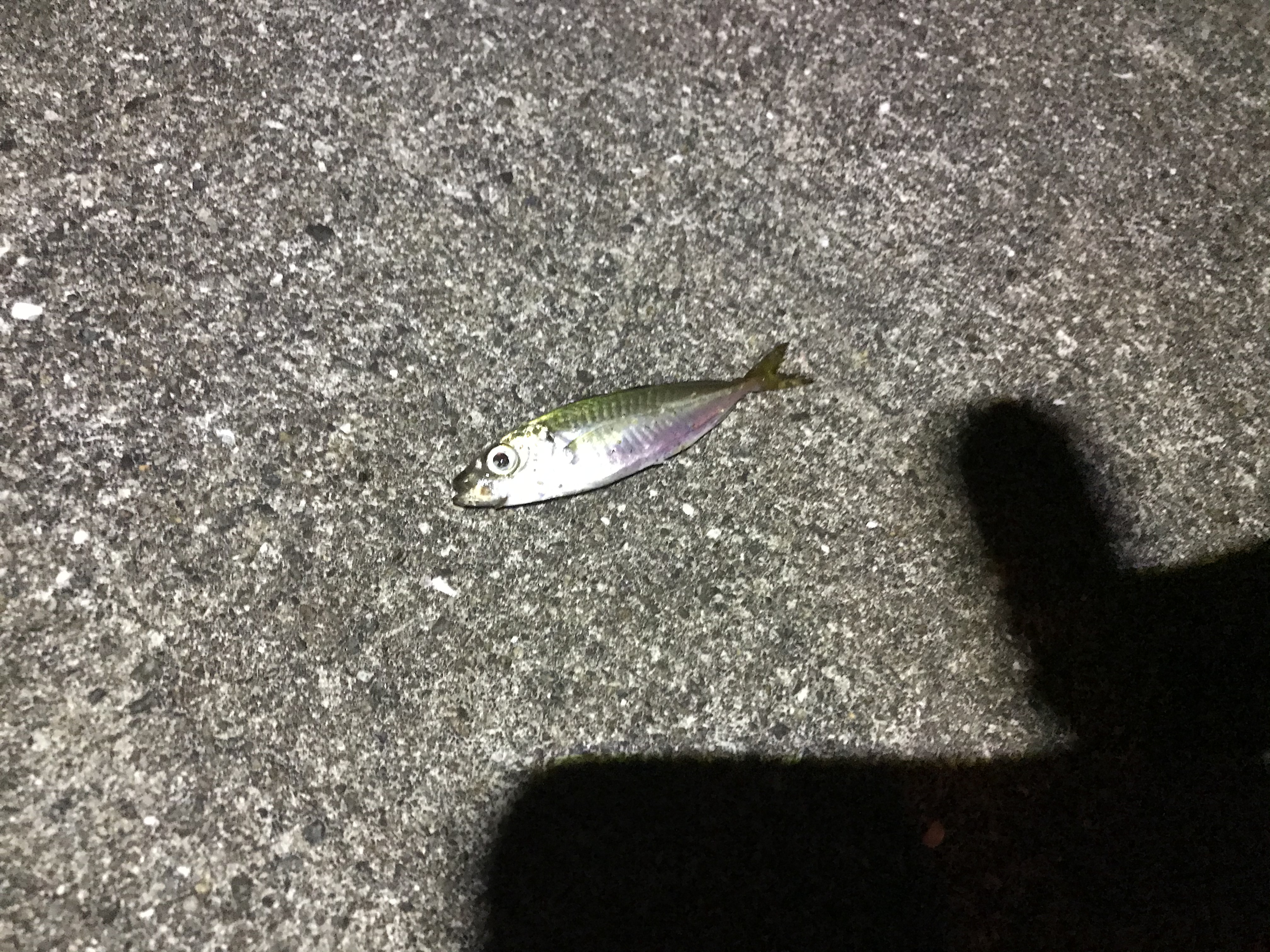 しかし、なかなかアタリがありません。そろそろ、帰り支度でもしようかな?と思っていたら待望のアタリを感じました。ついに、初アジか!?とあがってきたのは豆アジでした!残念(汗)