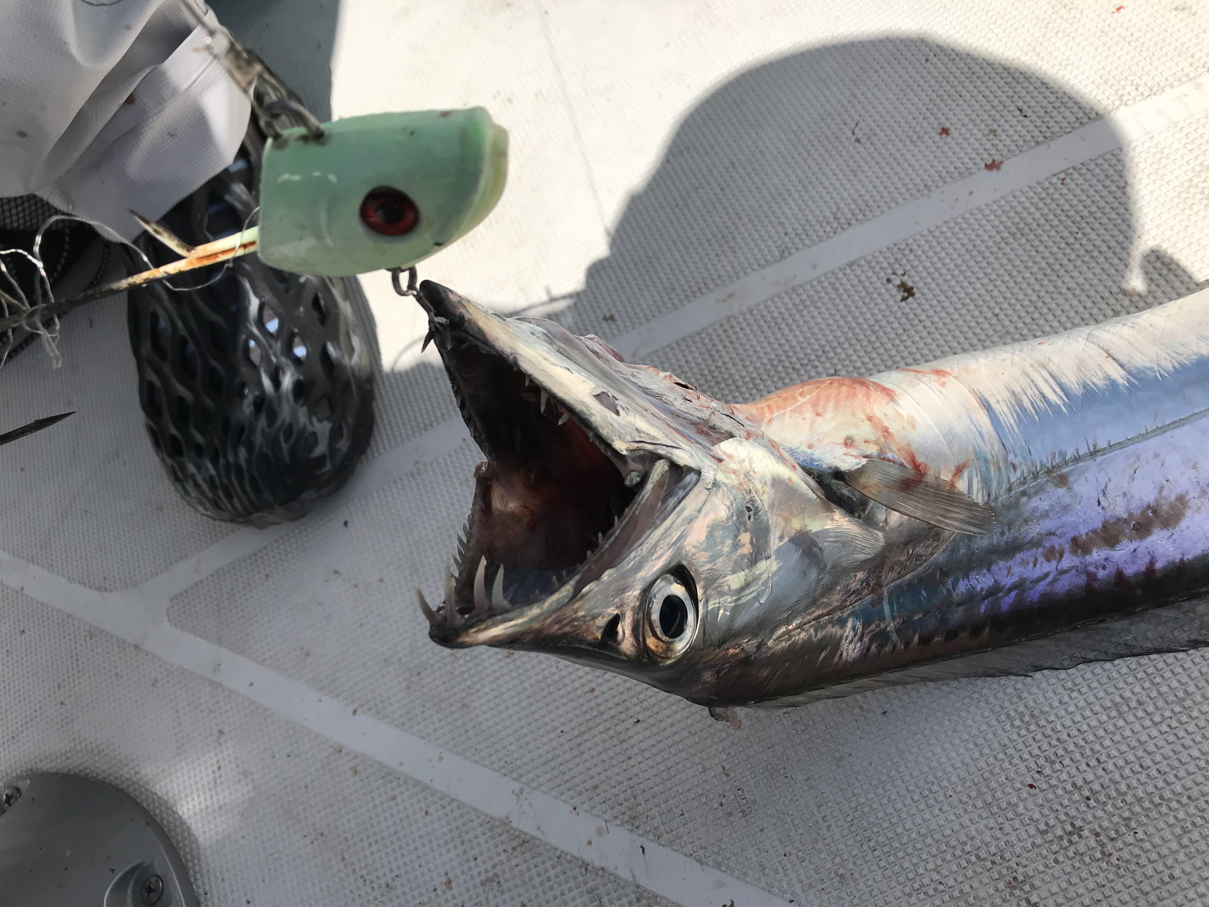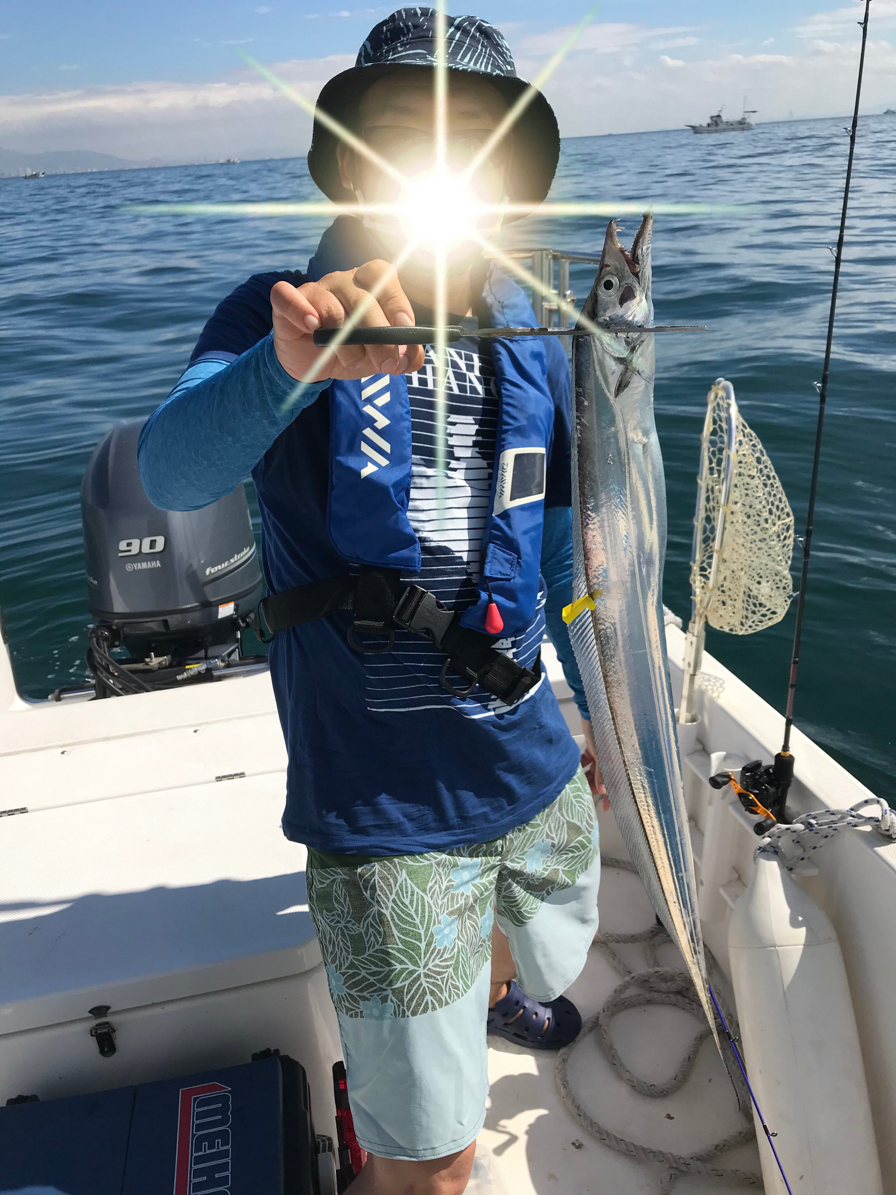 ほどなく横瀬に到着し、ドキドキの第一投し早くもヒットしました。しかし、ボートフィッシングでの太刀魚は久しぶりで、ラインを持ってあげれば良いものをロッドごと引っこ抜くといきなりハズれてまさかのバラシでスタート(汗)