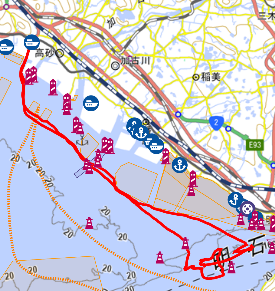 2020年当時は航行区域も広く明石海峡大橋の近くまで行けていたのですが
