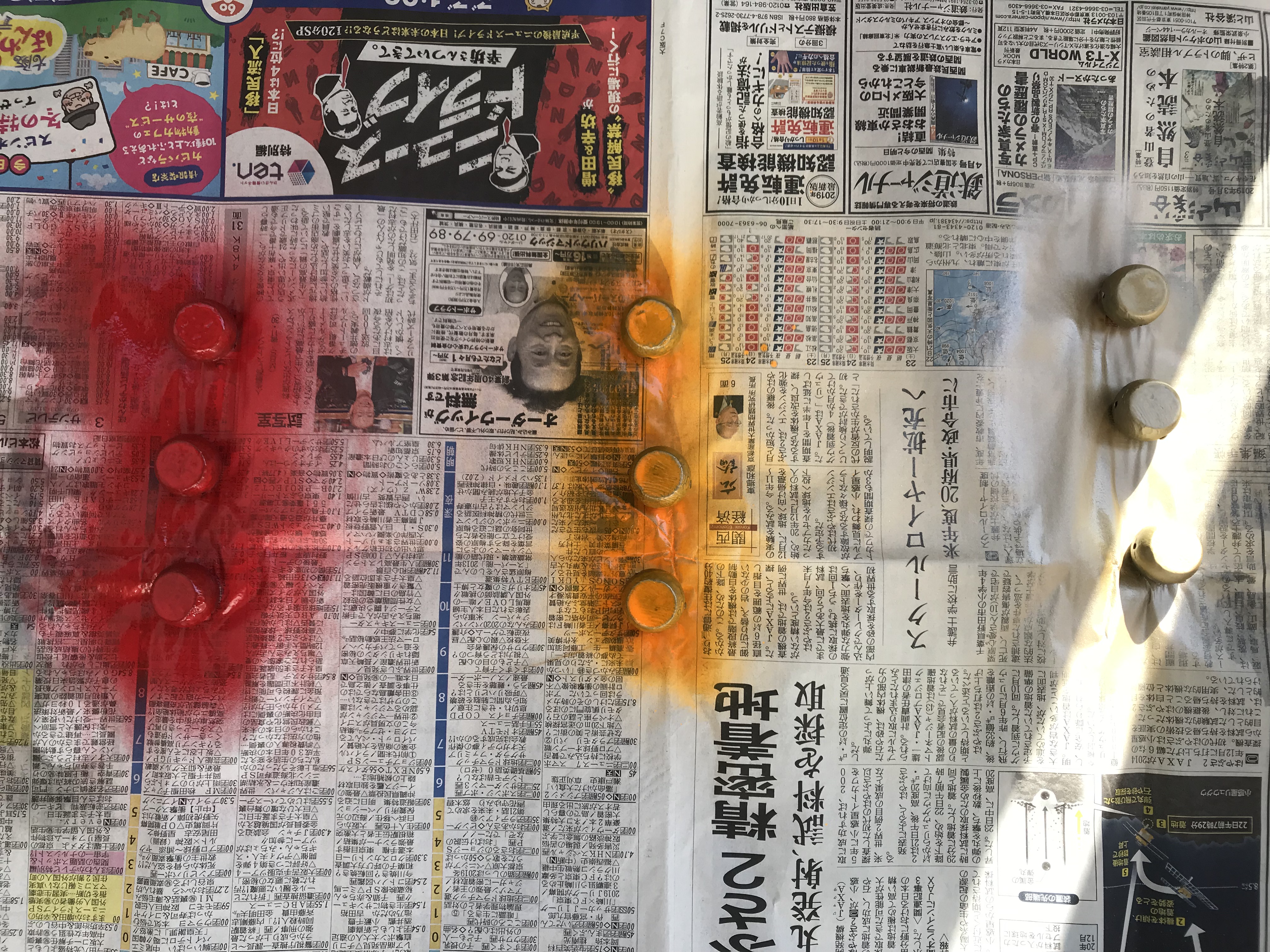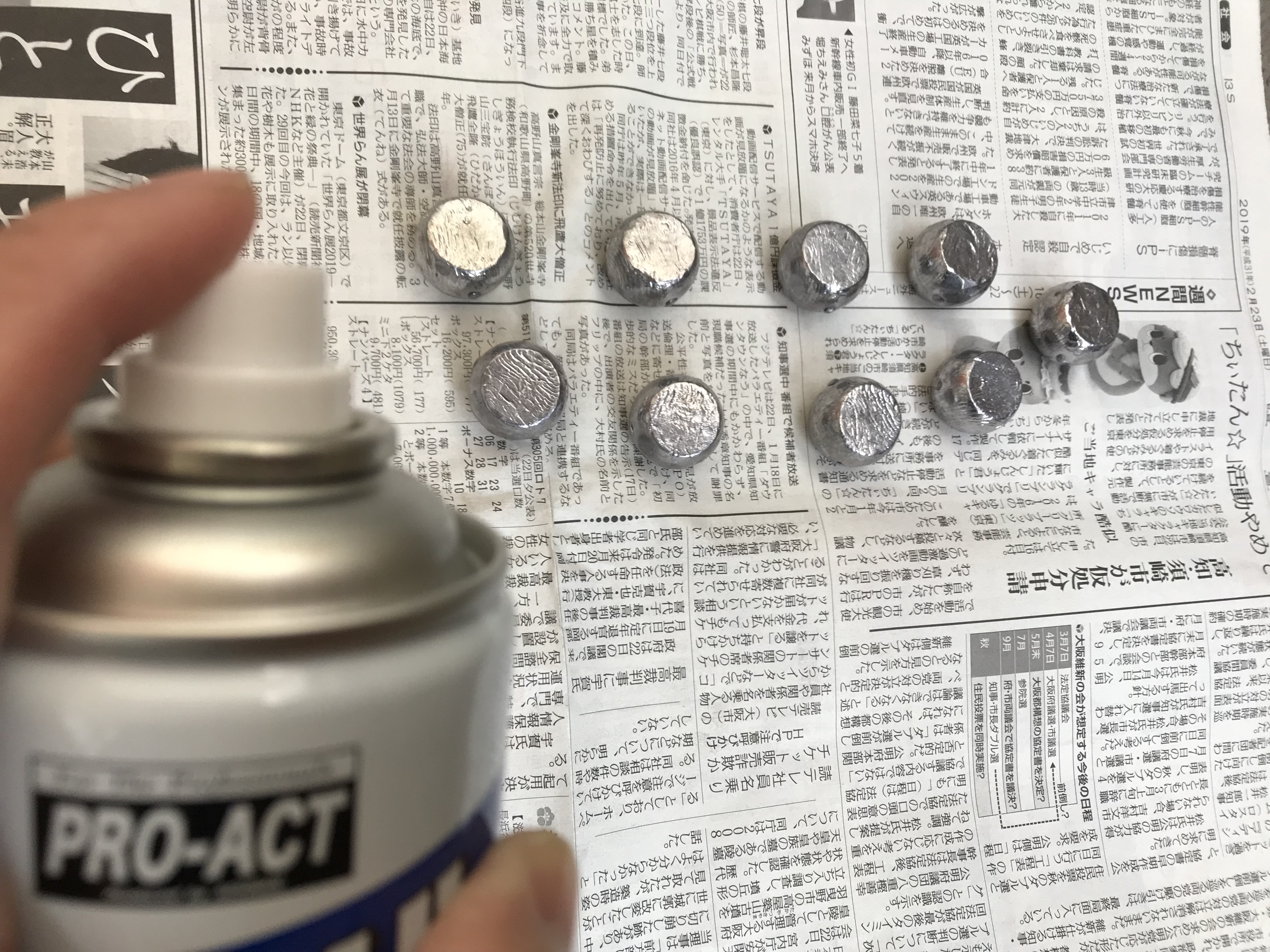 本格的に丁寧にカラーリングするならラインの穴に針金かなにか差し込んで宙に浮かせてスプレーすれば綺麗になると思うのですが、やはりスプレーを吹き付ければほとんどが空気中に舞うので昔ながらのプラモデルのカラーリングでよくする新聞紙の上に置いてスプレー吹き付けることにしました。