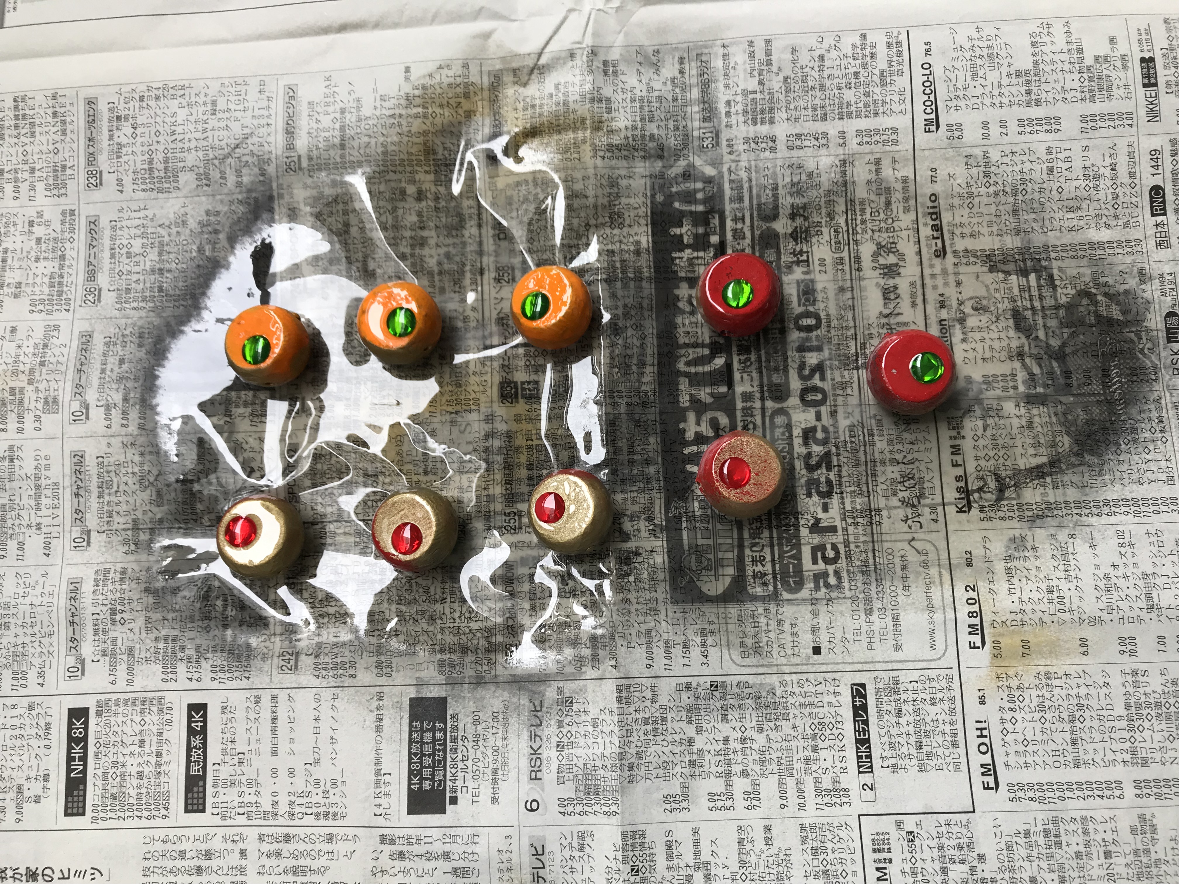 鯛ラバヘッド自体を作成したいところですが、さすがに鉛やヘッドの金型を作れないので、ここは市販されている鉛のヘッド(釣り上手鯛玉オモリタイプ25号)、アイシール、カスタムチューブ、アイシールと塗装用のカラースプレーを購入。